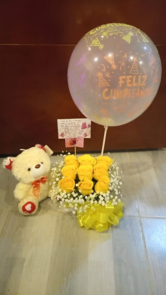 Caja por 9 rosas, peluche y globo